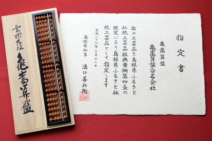 - 平成27年3月20日『亀嵩算盤』は「島根県ふるさと伝統工芸品」の指定を受ける事となり、島根県庁知事室にて指定書の交付を受けました。