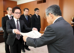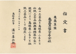 - 今回の交付では「亀嵩算盤」と「火の川焼」が新たに指定を受け、「袖師焼」「高橋鍛冶製品」「勝地半紙」は代替わりにより指定書を再交付されました。
