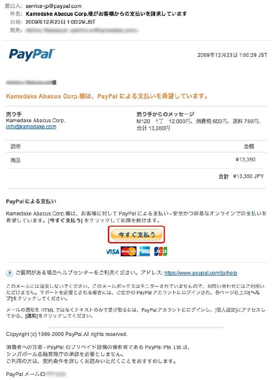 (4) PayPalより別途お客様宛てにお支払いの請求メールが送信されます。