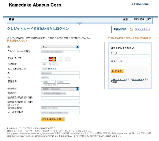 (7) 必要事項を入力し、「注文を確認して続行」ボタンをクリックします。